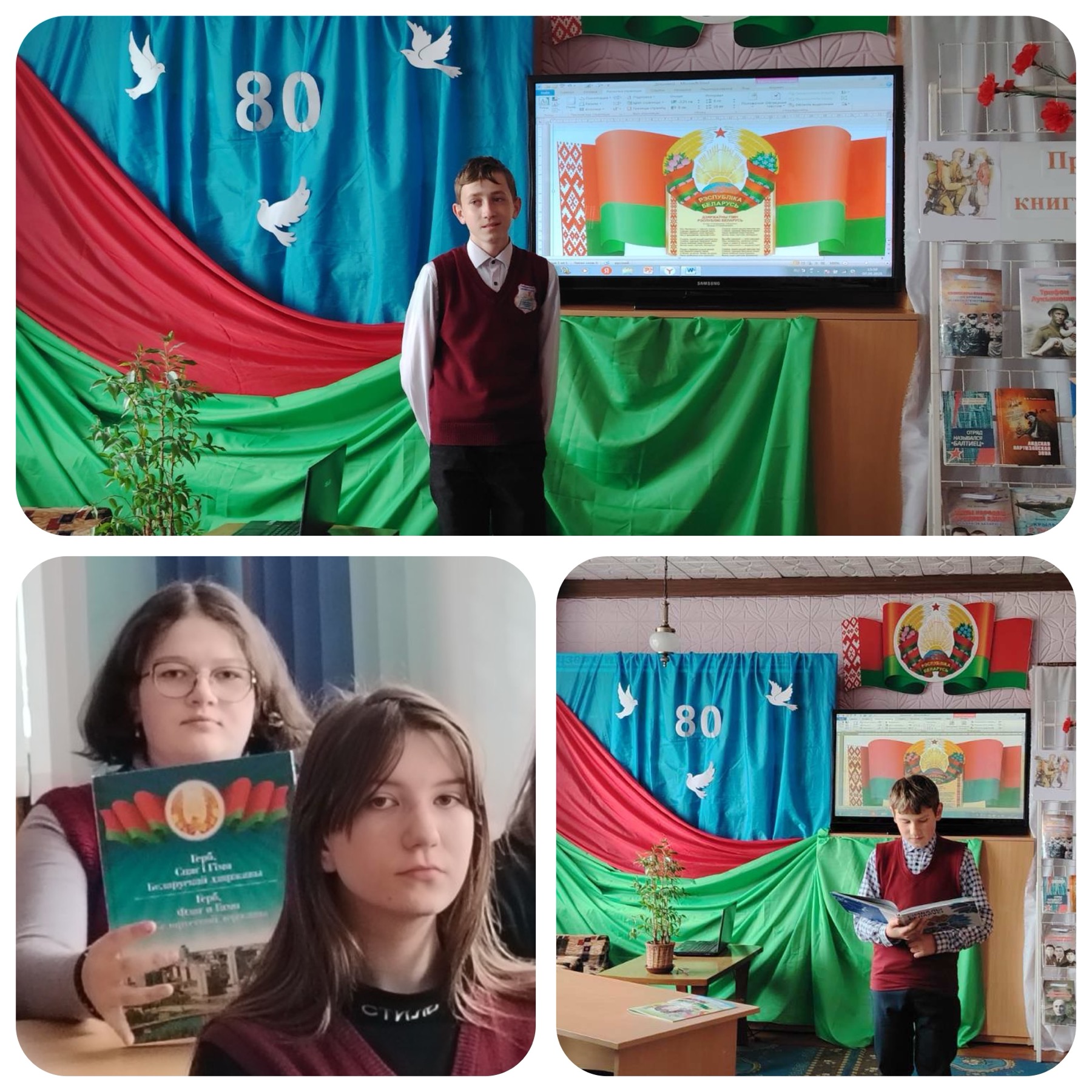 На мероприятии ребята познакомились с историей возникновения символов нашего государства – гербом, флагом, гимном. Прослушали гимн, определили значение эмблем, изображенных на гербе и флаге, а также значение их цветов, узнали о роли и значении символики в жизни каждого человека и страны в целом. Для закрепления полученных знаний учащиеся ответили на вопросы викторины «Как мы знаем символику Республики Беларусь?». К мероприятию была оформлена книжная выставка-призыв «Государственные символы – национальная гордость».