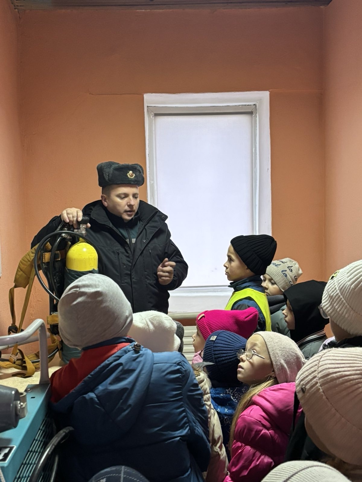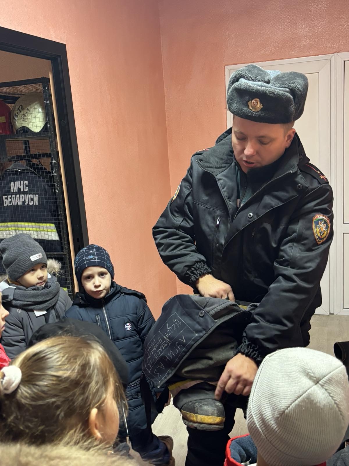 Но больше всего ребят привлекло оборудование, аварийно-спасательная техника, боевая одежда спасателей, возможность её примерять, а также посидеть в пожарном автомобиле, ощутить себя в роли спасателя.