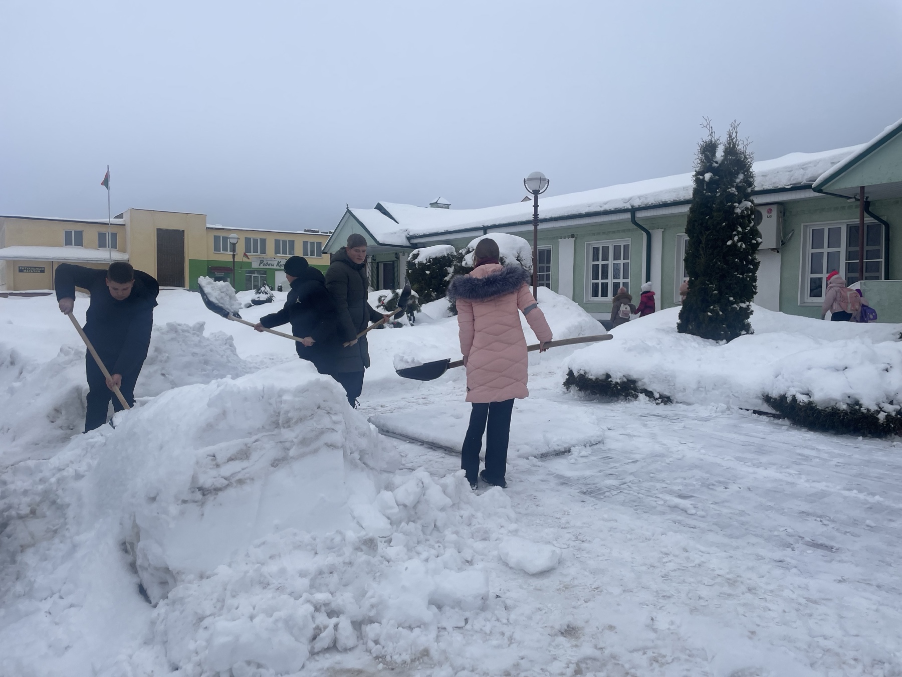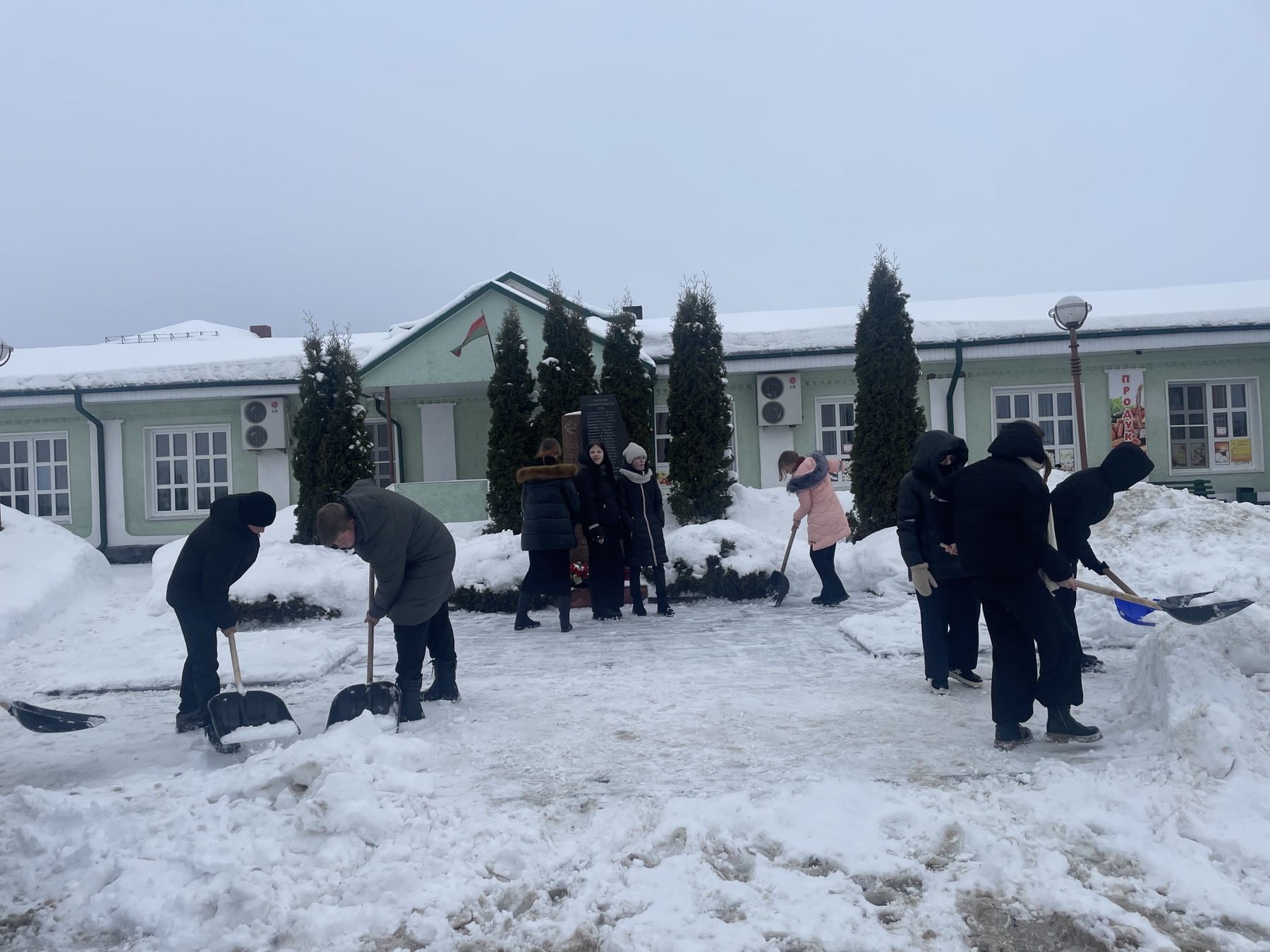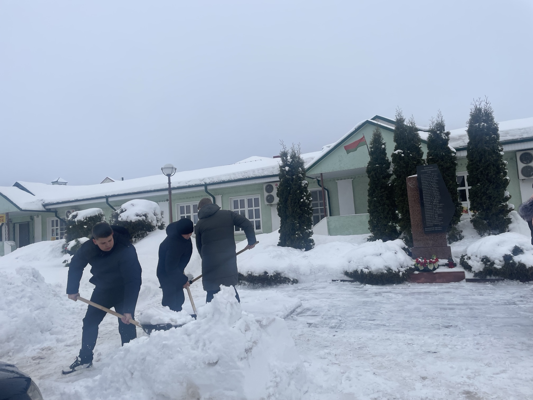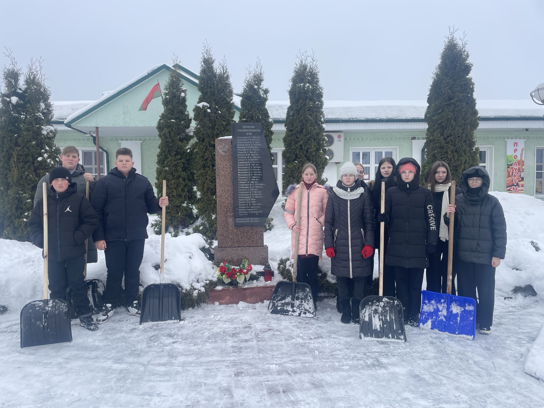 Ребята дружно убрали снег с дорожки, которая ведет к памятнику, территорию вокруг, освободили от снега сам памятник.